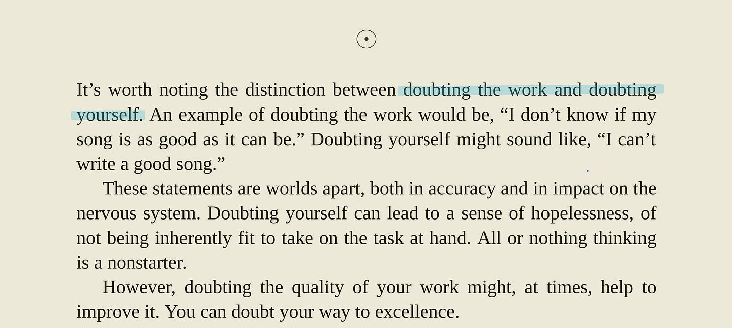 Most of this book is written in a continuous format with no narrative- you could flip to any page of this book, and come away with a random but thoughtful piece of creative advice. And that advice truly spans through so many aspects of creative work I couldn’t possibly go through them all. This is an excellent book to read if you're feeling creatively frustrated and can't pinpoint why.